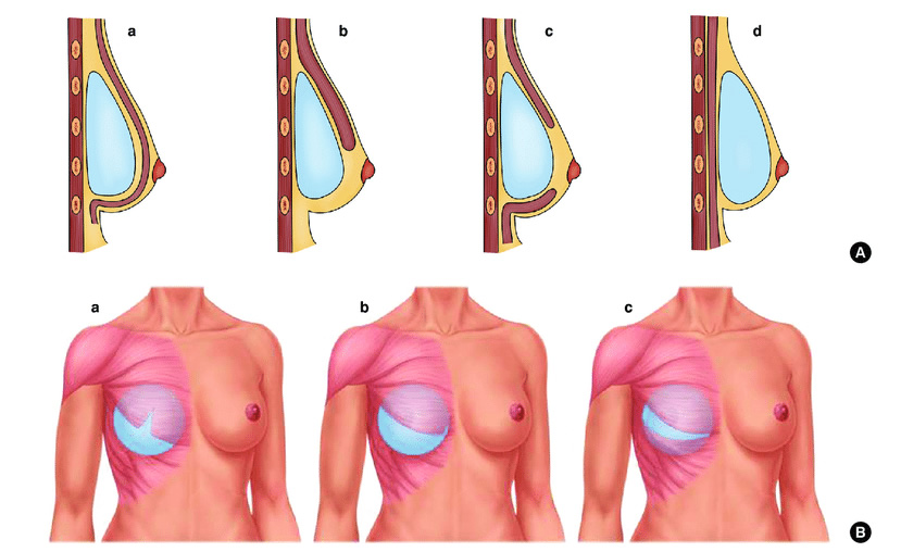 Ilustracije položaja implantata: (A) Slike koje prikazuju četiri različite vrste postavljanja implantata u bočnom prikazu: (a) subpektoralno, (b) dual-plane, (c) triple-plane, (d) prepektoralno. (B) Slike koje prikazuju tri različite vrste submišićnog postavljanja implantata u frontalnom prikazu: (a) delimično razdvajanje mišića I, (b) delimično razdvajanje mišića II (Regnault tehnika), (c) triple-plane.